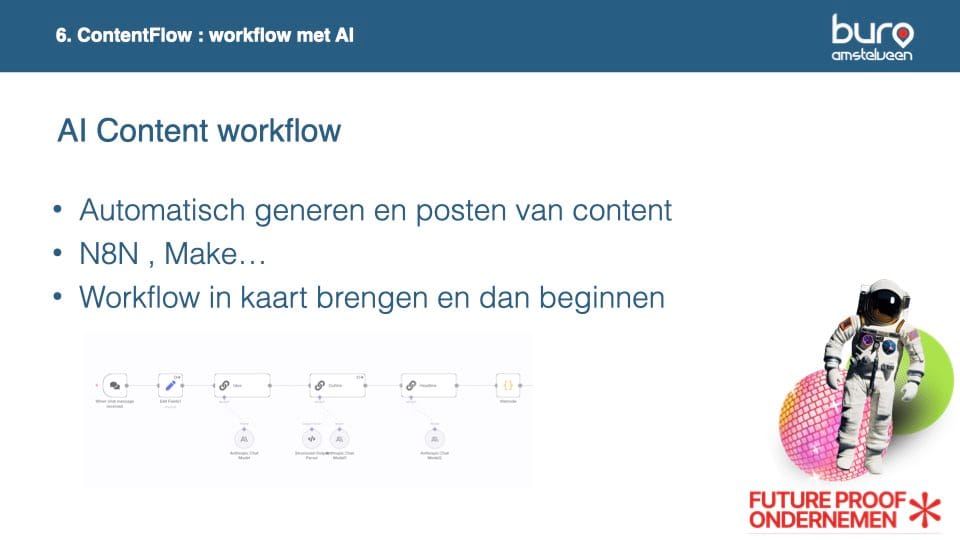 De live demo van de ContentFlow in n8n was een echte eyeopener, een slimme workflow die laat zien hoe je met AI niet alleen tijd bespaart, maar ook beter zichtbaar blijft in zoekresultaten én AI-antwoorden.