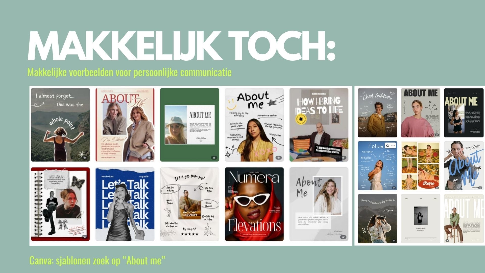 - Canva, voor al je visuals, social posts en presentaties. Werk met je eigen kleuren, lettertypes en beeldbank.